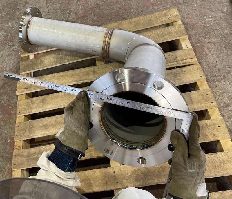 写真はフランジの穴と並行になっているかの確認作業を行っています